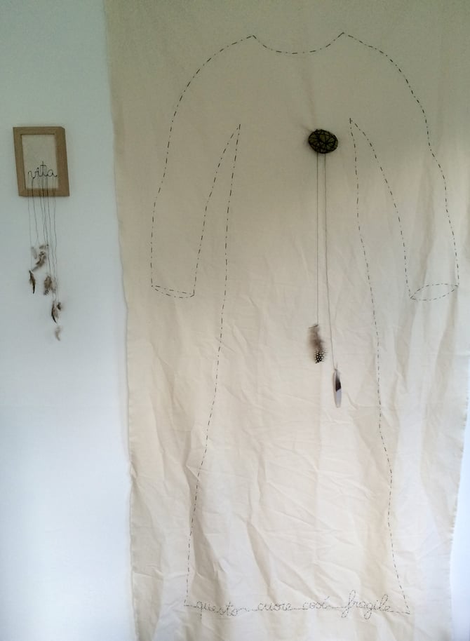 piume, ricamo e sasso su tela grezza 180x80 cm