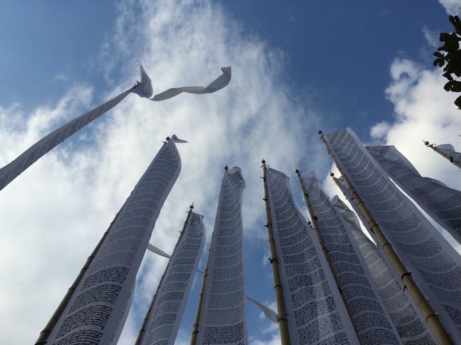 installazione per mostra arte collettiva a Maroggia - base legno, 35 pali bambù, bandiere scritte a mano 2.5xH6 m